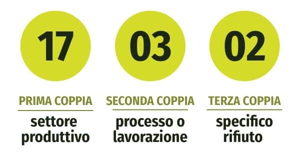 - la terza coppia di cifre – che va da 01 a 99 – rappresenta la categoria, ovvero indica le sostanze effettivamente contenute all’interno del rifiuto, quindi la sua tipologia.